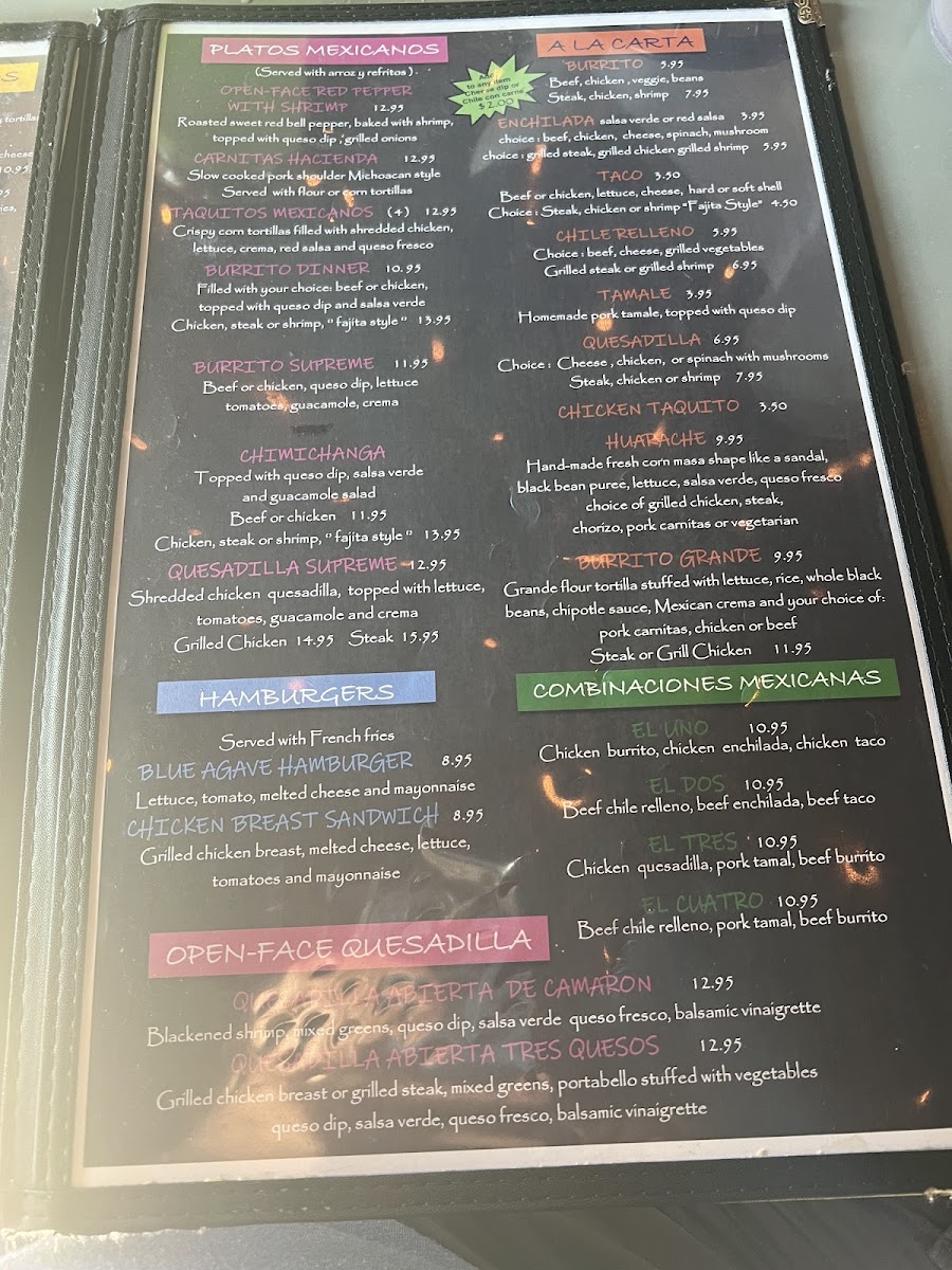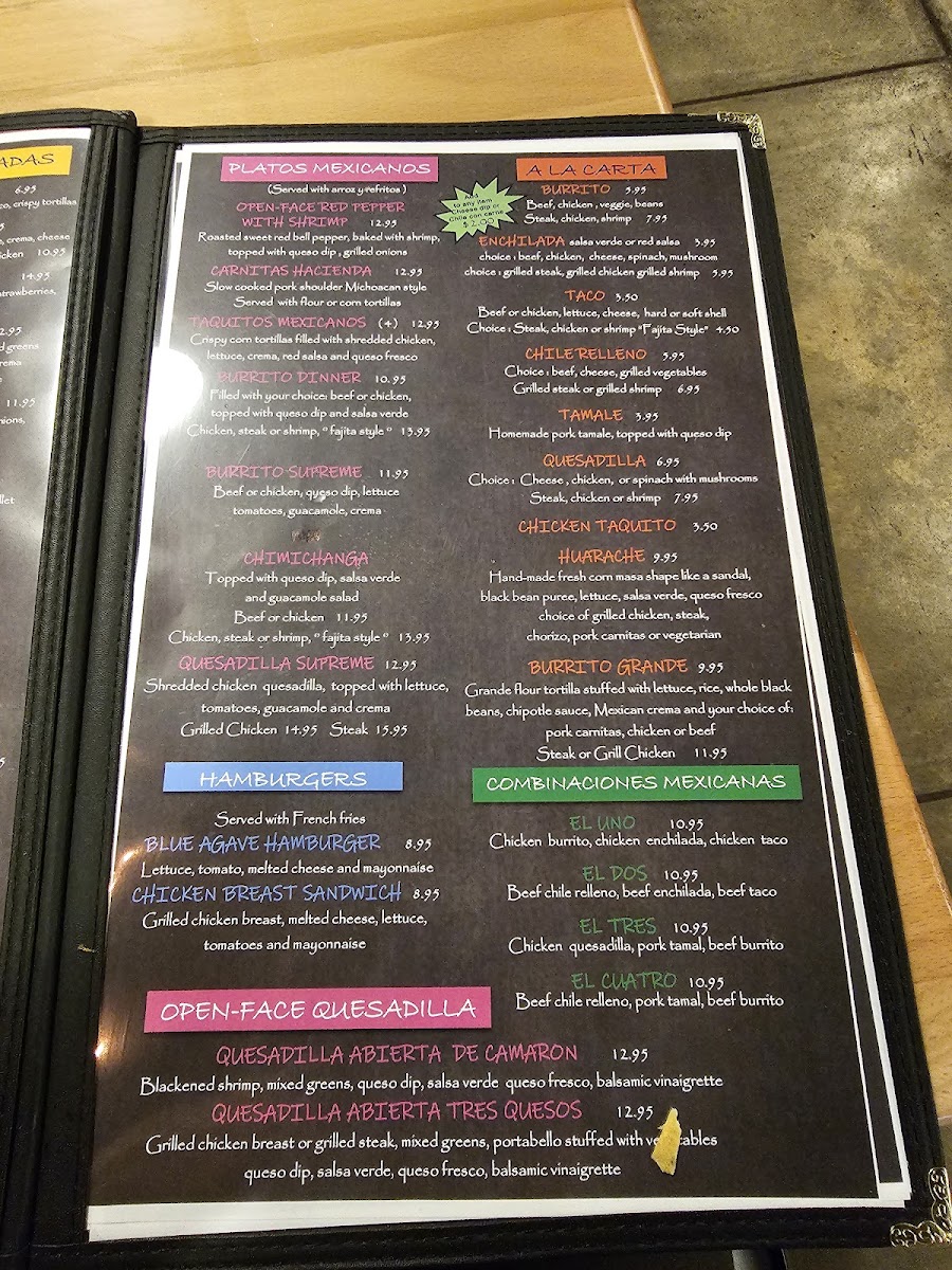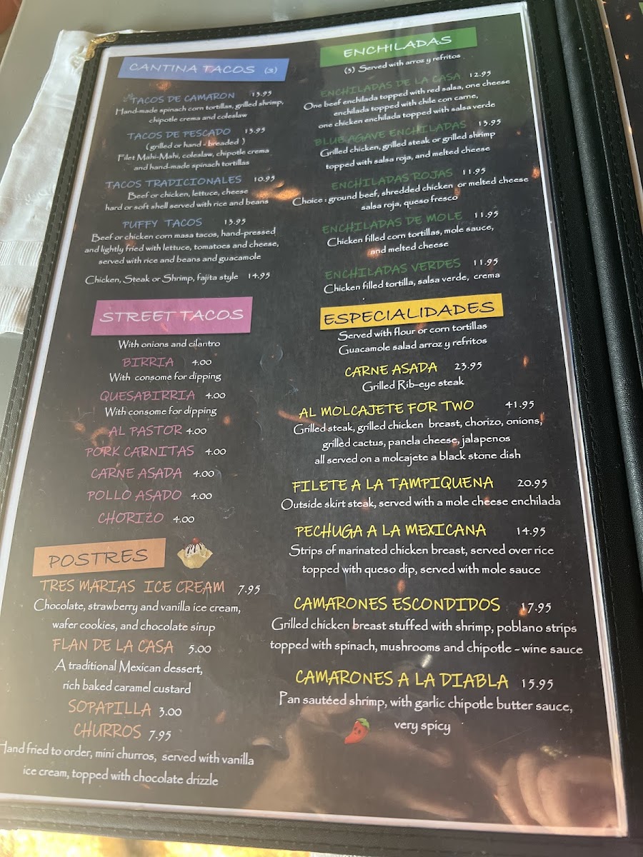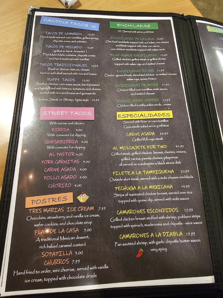 Blue Agave Cantina offers a delightful range of Mexican dishes with something for every palate. The Cantina Tacos menu includes options like Tacos De Camaron, Tacos De Pescado, and Tacos Tradicionales, along with their famous Puffy Tacos. For a unique twist, the Street Tacos are a must-try, featuring flavors like Birria, Quesabirria, Al Pastor, and Pork Carnitas, all served with a variety of meats including Carne Asada. In addition to tacos, the restaurant serves savory Enchiladas such as Enchiladas De La Casa, Blue Agave Enchiladas, and Enchiladas Rojas. If you’re in the mood for something a little different, the Especialidades section offers the Carne Asada, Al Molcajete For Two, and Filete A La Tampiquena, among others. For those seeking a lighter option, the Platos Mexicanos include dishes like Open-Face Red Pepper With Shrimp and the tasty Taquitos Mexicanos. The Postres or dessert menu offers indulgent treats, including Tres Marias Ice Cream, Flan De La Casa, and Sopapilla Churros. There are also hearty combos like El Dos, El Tres, and El Cuatro. Whether you’re craving traditional favorites like a Chicken Enchilada or Chile Relleno, or you want to dig into a Burrito Supreme, Blue Agave Cantina provides a varied and satisfying dining experience with a well-curated selection of Mexican classics.