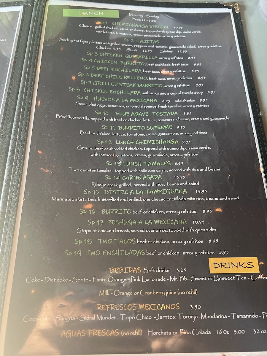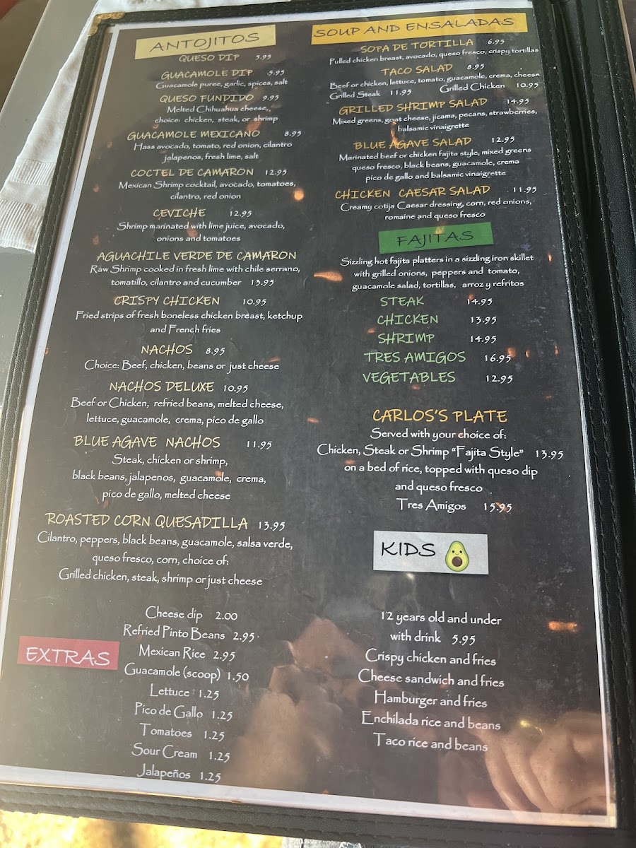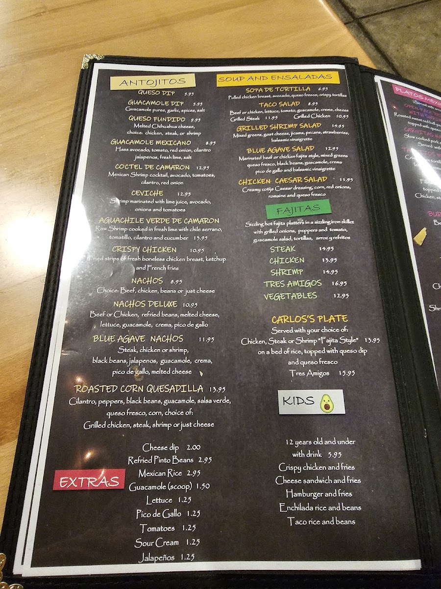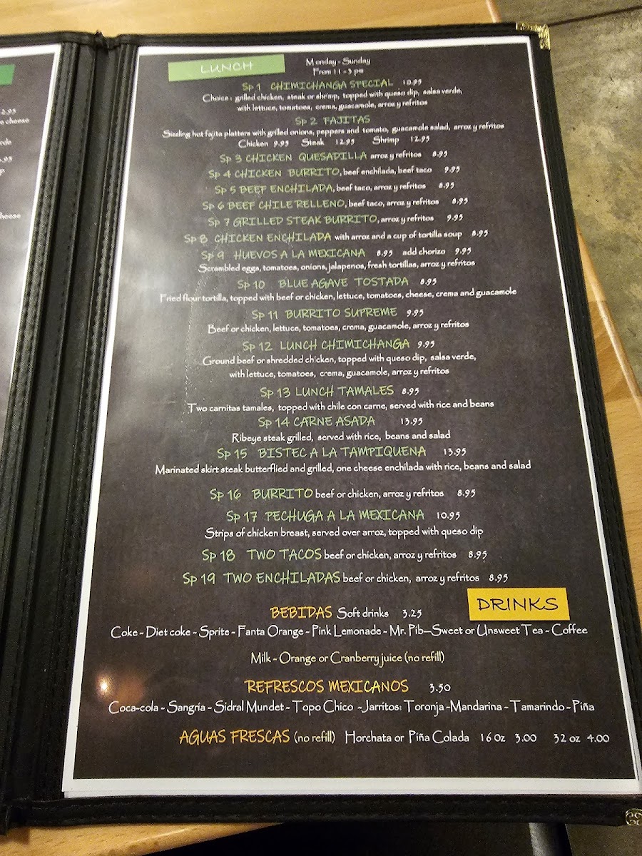 Blue Agave Cantina offers a delightful range of Mexican dishes with something for every palate. The Cantina Tacos menu includes options like Tacos De Camaron, Tacos De Pescado, and Tacos Tradicionales, along with their famous Puffy Tacos. For a unique twist, the Street Tacos are a must-try, featuring flavors like Birria, Quesabirria, Al Pastor, and Pork Carnitas, all served with a variety of meats including Carne Asada. In addition to tacos, the restaurant serves savory Enchiladas such as Enchiladas De La Casa, Blue Agave Enchiladas, and Enchiladas Rojas. If you’re in the mood for something a little different, the Especialidades section offers the Carne Asada, Al Molcajete For Two, and Filete A La Tampiquena, among others. For those seeking a lighter option, the Platos Mexicanos include dishes like Open-Face Red Pepper With Shrimp and the tasty Taquitos Mexicanos. The Postres or dessert menu offers indulgent treats, including Tres Marias Ice Cream, Flan De La Casa, and Sopapilla Churros. There are also hearty combos like El Dos, El Tres, and El Cuatro. Whether you’re craving traditional favorites like a Chicken Enchilada or Chile Relleno, or you want to dig into a Burrito Supreme, Blue Agave Cantina provides a varied and satisfying dining experience with a well-curated selection of Mexican classics.